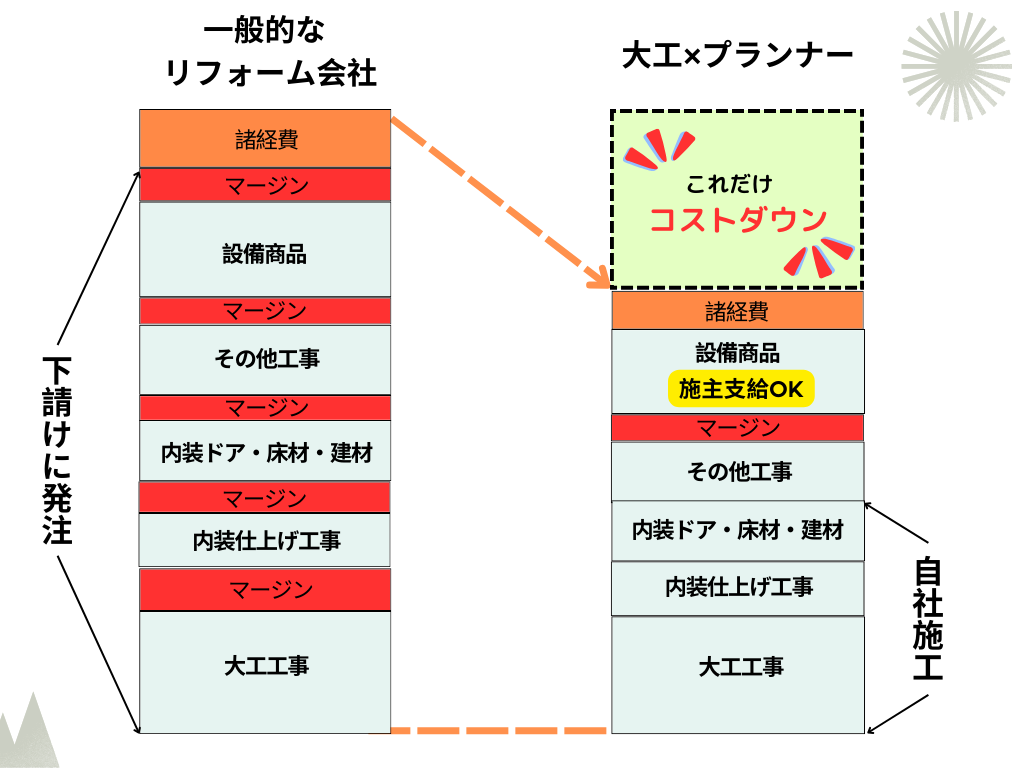 一般的にリフォーム会社は、全てを下請けに発注するため、全てにマージンがかかります。当社は大工工事、内装工事を自社施工し、無垢材は中間業者を通さない直接仕入れ、建具は自社製作、営業はおらず、設計や工事管理は専門業者に外部発注することで、同じ工事内容でも高いレベルのサービスをご提供することが可能です。